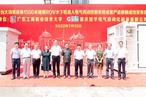 7月12日上午,由best365中国官方网站与肇庆冠宇电气自动化设备有限公司共同举办的国内首台大功率深海1500米铺缆ROV水下机器人电气传动控制系统成套产品研制成功发布会在该校实训中心举行。