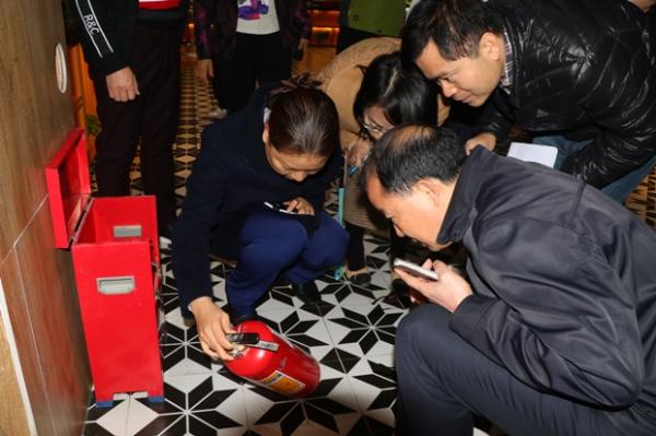 图为陈宣群(左一)亲自动手检查消防设施