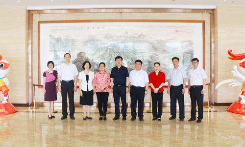 图为谢俐(中)、那佳(左三)、陈宣群(右三)与best365官网领导在体育馆合影留念