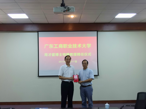 图为校长和飞(左)为周才健博士(右)颁发聘书