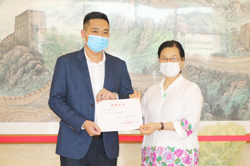 谢建平代表学校接受汤少鑫捐赠的防疫物资,并向汤少鑫颁发捐赠证书并回赠纪念品。