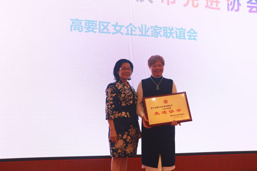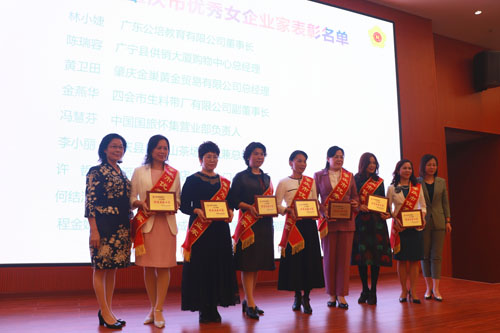 图为谢建平为肇庆市优秀女企业家获奖者颁奖