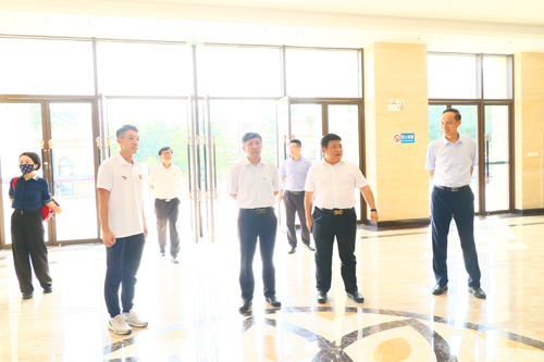 图为赵康一行在校领导的陪同下参观体育馆