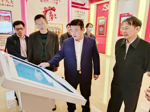 图为张宏伟(右一)一行在校领导陪同下参观VR党建馆