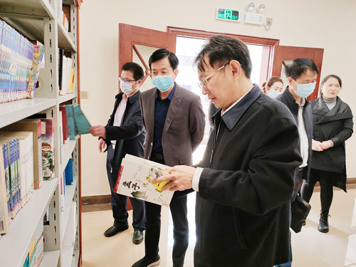 图为张宏伟一行在校领导陪同下参观图书馆