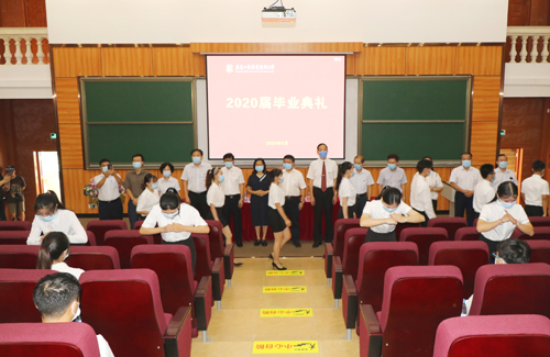 6月29日上午10时,best365中国官方网站2020届毕业典礼在致知楼213阶梯教室举行。学校董事会、校行政、校党委领导、各学院院长书记、职能部门负责人、教师代表、毕业生代表约100人参会。会场的座位安排颇具心思,第一排是校领导,从第二排到第七排是毕业生代表,其他参会人员被安排在后排就坐。9:50分,当54名代表着今年54个班级同学的毕业生代表整齐列队进入会场时,全体参会人员起立鼓掌欢迎,一直到毕业生代表全部落座,热烈的掌声才渐渐平息。三年来他们参加了无数次学校举行的大会,每一次都是学生们坐好了等待老师领导上场,今天,是老师领导们坐在位置上等待自己的学生入场,让毕业生们感受了一次作为学校学子、作为学校毕业生的幸福和尊荣;毕业典礼程序结束,毕业生代表一排排起立,集体向后转,向在座的老师们行谢师礼,在场的老师们也向自己的学生们还礼,毕业生们依次走向前台,向站在第一排的校领导行谢师礼;然后是第二排,第三排……随着毕业典礼进入高潮,后排的老师们跟着音乐节奏打起了节拍,一直将毕业生代表送出了会场。程序体现精神,细节也是教育,许多毕业生代表认为这样的安排细心周到,他们会牢记在心,感恩母校;许多教师代表也认为这样的设计体现了学校以人为本,体现了对毕业生的尊重和关爱,值得发扬广大。