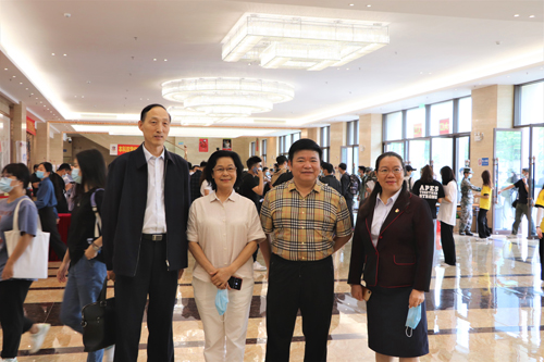 图为谢建平(左二)、莫秀全(右二)、校长和飞(左)、副校长江雪珍(右)在迎新现场指导