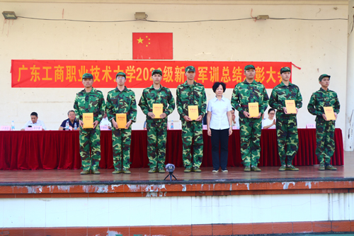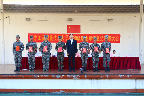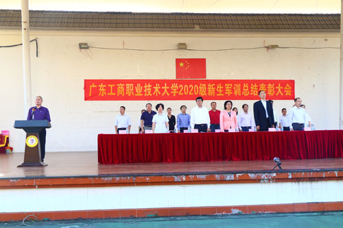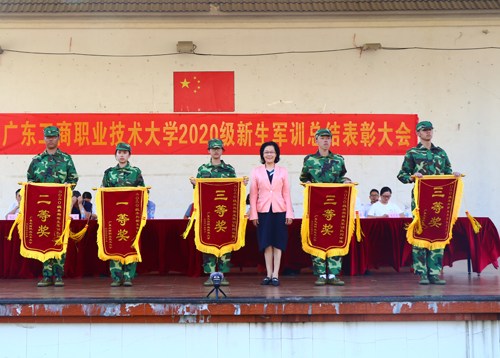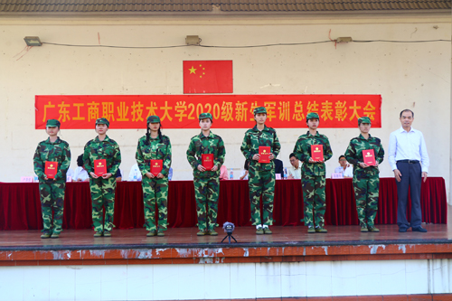 陈伊娜宣读《关于表彰2020级本科新生军训先进集体和个人的通报》表彰文件。随后大会对军训突出表现的先进集体和个人进行表彰。其中计算机学院获得团体总分第一名;商学院及艺术学院、人工智能与大数据学院和健康家政与管理学院获得团体总分第二名;建筑工程学院、外语学院、文化与传播学院获得团体总分第三名。谢建平为军训列队会操团体总分前三名获奖代表颁奖;陈伊娜为军训标兵获奖代表颁奖;苗德华为军训标兵宿舍获奖代表颁奖;和飞为优秀教官获奖代表颁奖。