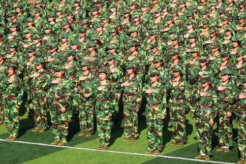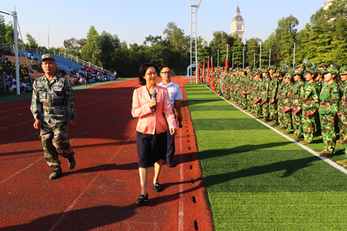 伴着激昂的音乐,谢建平在军训总指挥的陪同下检阅了新生方阵。“同志们辛苦了!”“为学校争光!”,响亮的口号声响彻云霄,震耳欲聋。