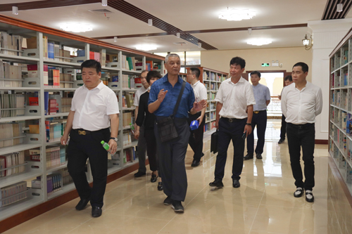 图为梁赞文一行在校领导陪同下参观图书馆