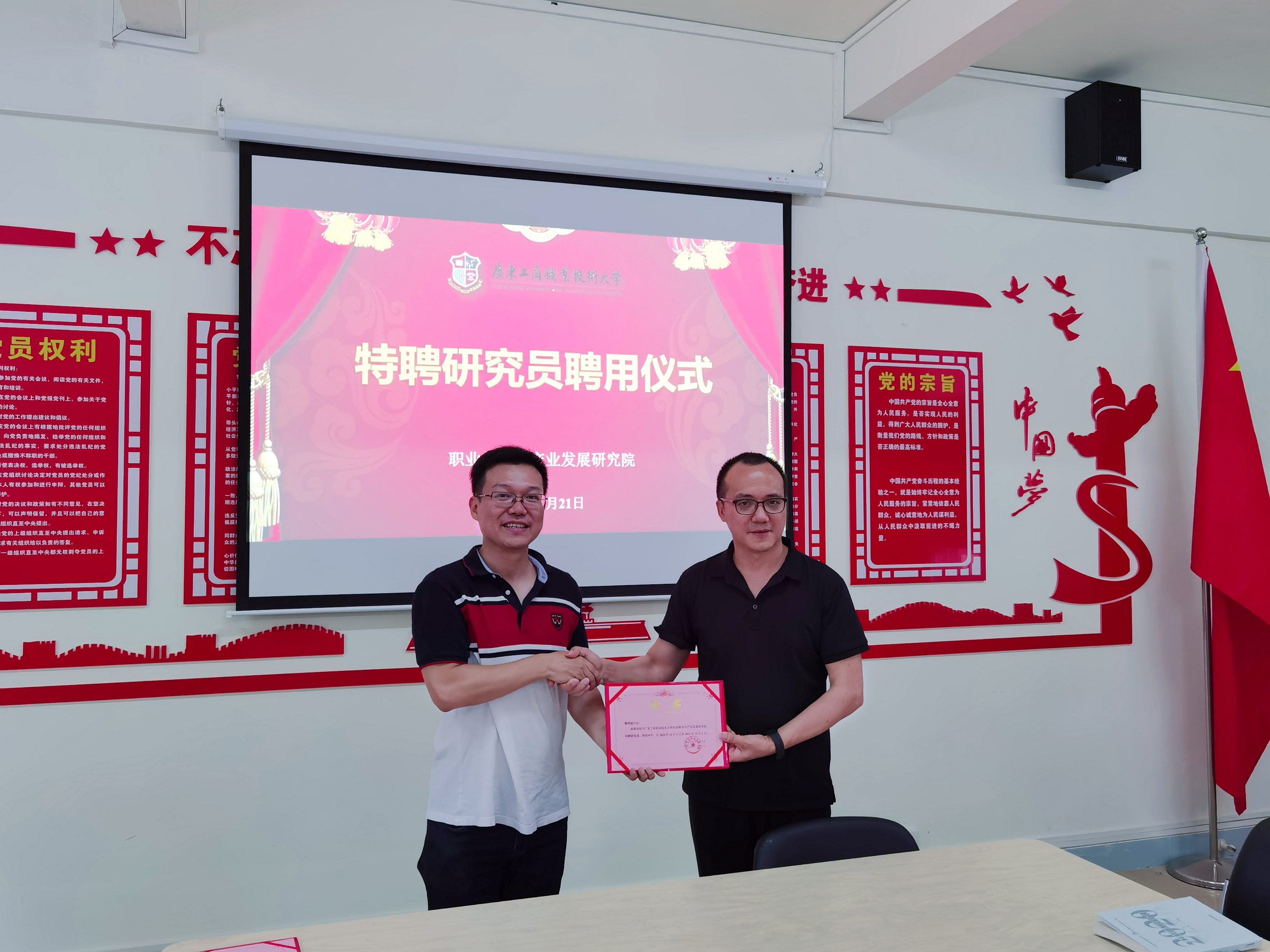 会议伊始,best365官网职业教育与产业发展研究院与广州番禺职业技术学院高职教育研究所签订《战略合作框架协议》。会议强调,双方通过建立战略合作关系,实现优势互补,协同发展,繁荣职业教育学术研究,推动职业教育改革实践。双方表示,日后将逐步扩展和深化双方多领域、多层面的合作,积极探索多元化的合作模式,建立良好的工作机制,并稳步推进和落实合作事宜。紧接着,方校长为校外特聘研究员樊明成、赵锋颁发聘书并合影。会议指出,特聘研究员要按照best365官网特聘研究员管理办法的规定和要求,认真履行岗位职责,高质量完成聘期研究任务。