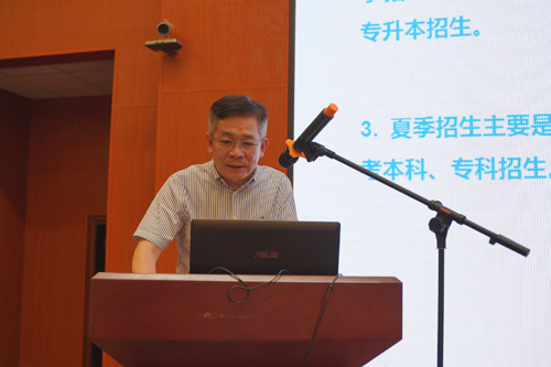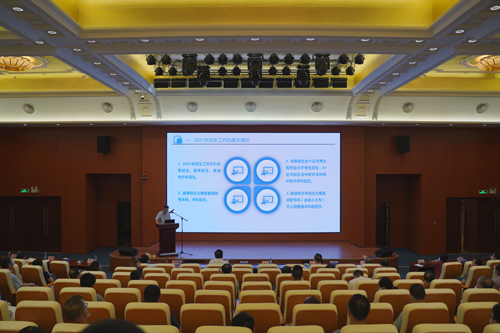 副校长刘志坚从2021年招生的总计划、省外招生计划、夏季招生录取时间节点等方面对2021年招生工作的基本情况进行了介绍说明,并对2021年夏季招生工作进行了部署。为确保顺利完成年度招生计划,刘志坚提出了三点建议:一是统一思想、行动一致;二是想方设法、全员发动;三是提升能力、规范管理。
