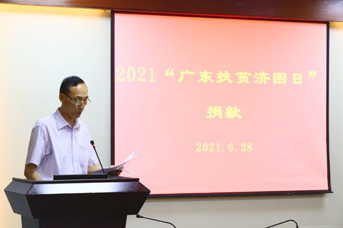 校长和飞主持活动。和飞指出,2021是中国共产党建党百年华诞,是“十四五”规划开局之年,是推进巩固拓展脱贫攻坚成果同乡村振兴有效衔接的起步之年,开展扶贫济困捐款活动,对于巩固广东省脱贫攻坚成果,助力乡村振兴具有重要的意义。和飞要求全校师生员工发扬“乐善好施”的中华优秀民族传统,传承“献爱心”的社会责任,积极参与到扶贫济困捐款活动中来,用爱心播撒真情,以行动践行善举。