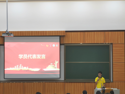 首先,来自计算机学院20级数字媒体应用3班的黎骏华作为本次青马班学员代表上台发言。他表示,作为新时代的青年大学生,不仅要积极主动学习党史、掌握党的理论创新成果、了解国情、认识社会,还应该勇于肩负时代重任,担起作为学生骨干的责任,坚定信念、刻苦学习、接续奋斗,积极主动有作为,成长为有理想、有本领、有担当的青年马克思主义者。