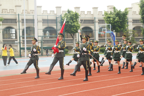 升旗仪式开始,国旗护卫队迈着整齐的步伐,以饱满的精神护送五星红旗入场。随后,升国旗奏唱国歌,全体师生肃立,行注目礼。
