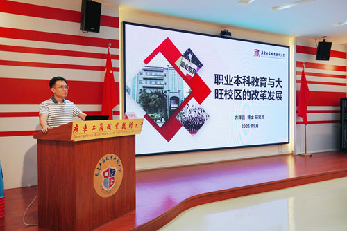 讲座中,方泽强从职业本科教育和高校、大旺校区的成绩与不足、旺校区的挑战与机遇和大旺校区改革建设展望四个方面展开讲述。
