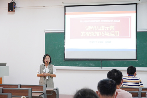 第四讲是由马克思主义学院潘莲娣老师围绕《课程思政元素的提炼技巧与运用》为主题展开。首先潘老师以“我们授课时该如何运用思政元素?”为题与学员们进行互动交流。随后,她与学员们交流了在授课中运用思政元素的技巧,例如在课程中嵌入时事元素,利用“俄乌战争”“中美贸易战”“英国脱欧”等事件,提炼出与课程相关的内容并加以运用。其次,潘老师强调高校课程思政的核心要旨是充分发挥教师队伍“主力军”作用,在教学过程中贯彻课程思政的理念并加以运用,从而帮助学生形成正确的价值观和人生观,引导学生将所学、所感、所悟内化于心 ,外化于行。