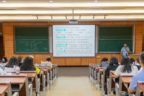 首先,张斌从中国改革开放前、中国改革开放后、世纪之交时期、新发展时期四个阶段给同学们讲述了我国外交战略自建国以来先后经历的过程,强调了构建新型国际关系是中国特色大国外交的优先方向和首要考量,构建人类命运共同体是中国特色大国外交的最终追求和最高理想。