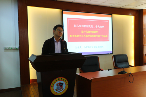 讲座上,马院巴昭军围绕“新时代民办高校坚持和加强党对教育工作全面领导的实践路径”,从理论、发展历程以及路径三个角度详细阐述了在党建示范创建和质量创优工作引领下新时代民办高校高质量党建工作体系的构建,巴昭军特别强调了把握党建特色和best365官网试点工作的关系、把握党建引领和校训理念的关系、把握党建重点与高质量教育体系的关系和把握党建“核心”与业务“中心”的关系,旨在让参会教职员工充分了解民办高校中党对全面工作领导的重要性,明确自身的责任和使命,加强政治意识的教育,充分保障思政教育工作。