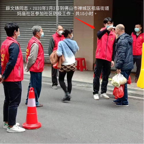 自2月2日起,薛文铸在确定自己身体健康状况后,积极响应当地号召,投入佛山市禅城区妈庙社区的防疫工作中。