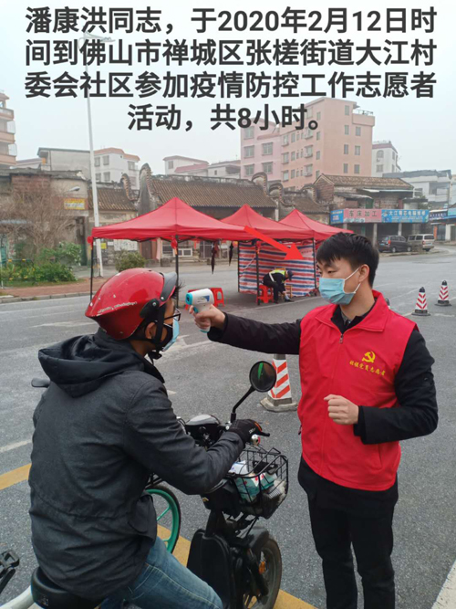 2月11日—13日,潘康洪佛山市禅城区张槎街道大江村委会社区参加疫情防控工作志愿者活动,对过往人员进行体温检测。