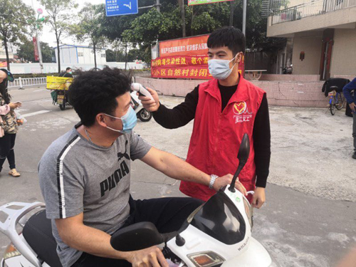 图为刘伟坚于2月19日至20日在广东省江门市蓬江区荷塘镇吕步村帮外来人员体温检测活动