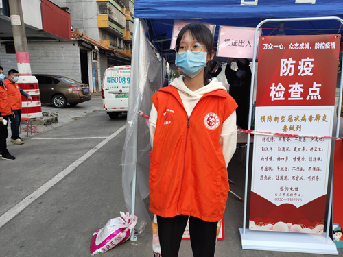 图为黄绮烨于2月20日至22日在广东省江门市台山市台城镇南塘社区参与疫情防控活动