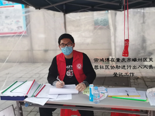 图为宗鸿博在广东省肇庆市端州芙蓉社区做进出人员登记工作