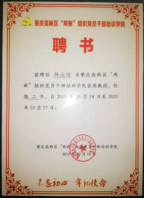 10月18日,肇庆高新区“两新”组织党员干部培训学院举行教授聘任仪式,我部韩治国部长受聘。