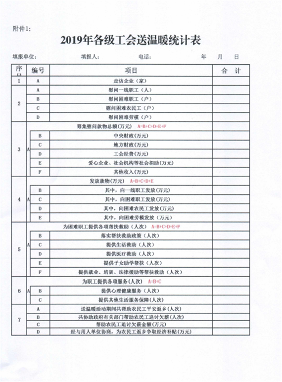 一、请各县(市、区)总工会于1月20日前将送温暖活动报告和送温暖统计表、帮扶中心统计表报送市职工服务中心(电子邮箱:576412217@qq.com),并请登录全国工会帮扶工作管理系统【报表管理】模块,在帮扶软件上逐级上报两个统计表的具体数据。