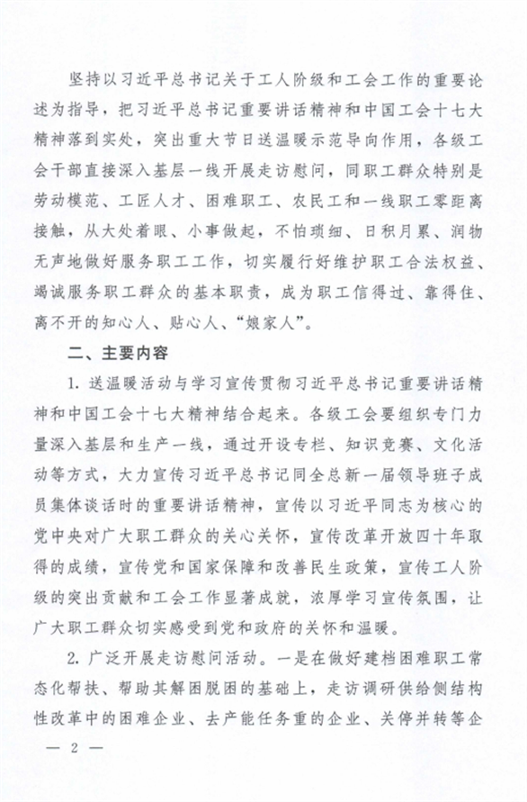 为做好2019年元旦春节期间送温暖活动,现将《转发中华全国总工会办公厅关于2019年元旦春节期间组织开展送温暖活动的通知》(粤工办〔2018〕106号)转发给你们,请按通知要求认真贯彻落实。